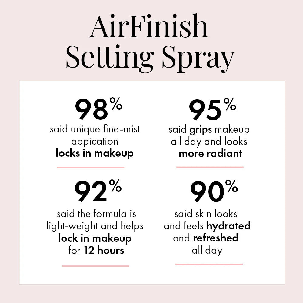- Goodbye, reapply: Forget lugging your full makeup bag around for touch-ups throughout the day. Just spritz a little AirFinish and you’ll look great till bedtime.