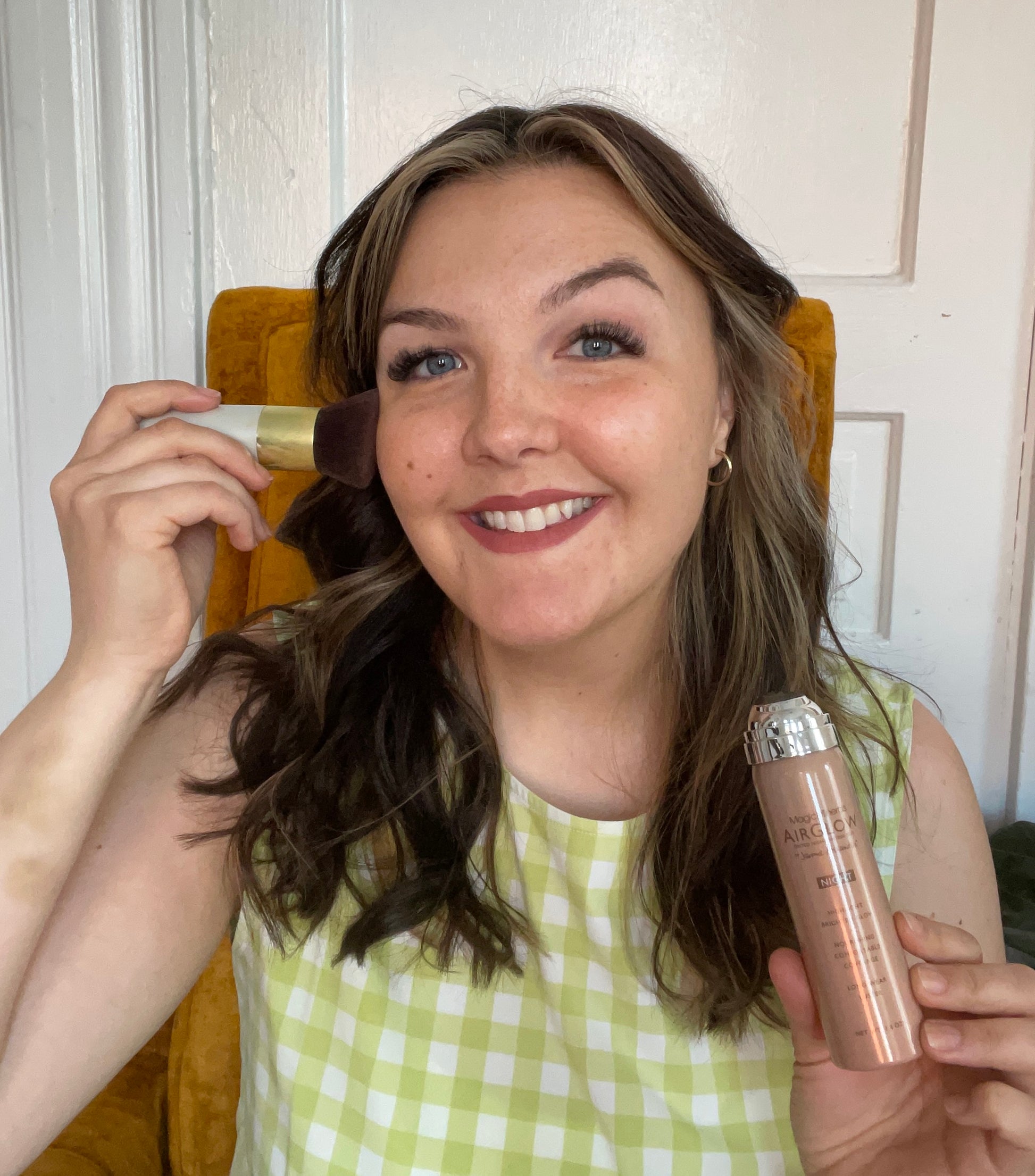 Officially our most versatile product ever, you can wear AirGlow in four different ways. Use it alone as a tinted illuminating face primer for a hint of shimmer and subtle color. Or, for a little more coverage plus a healthy glow, layer under your AirBrush Foundation. Mixing with AirBrush before you apply gives you a more lightweight, sheer, and shimmery finish. Or dab over foundation as a bronzer and highlighter to add radiance and definition.